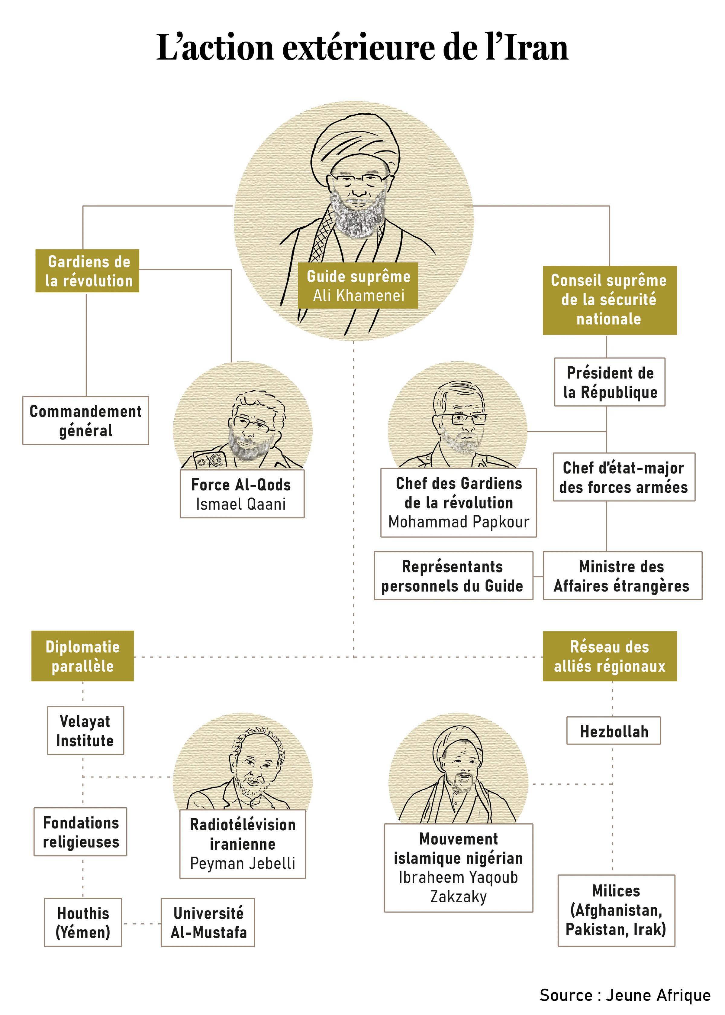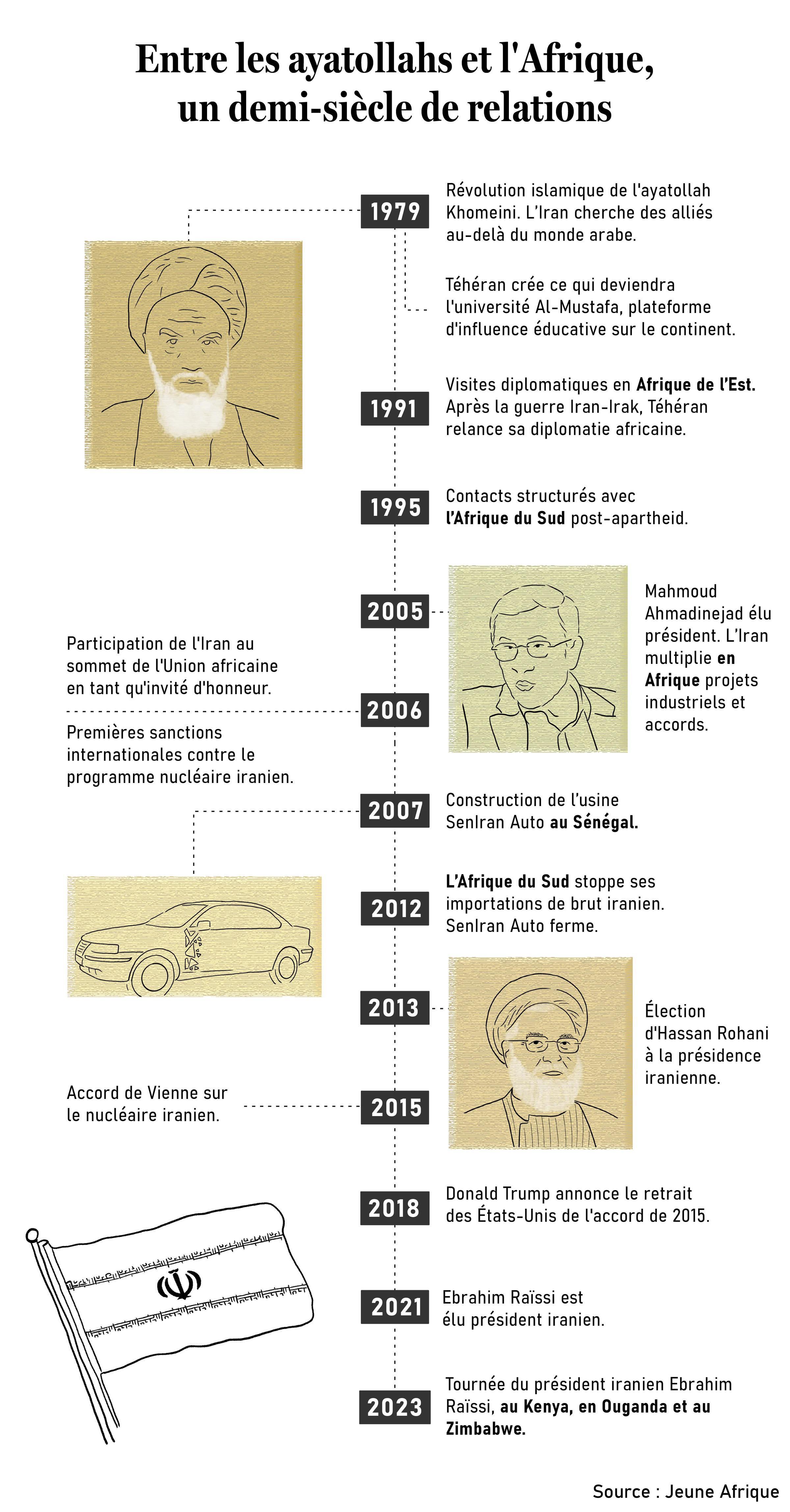 مصادر دبلوماسية وأمنية تورد أن دبلوماسيين وشبكات وساطة لعبوا أدوارًا محورية في تعميق الحضور الإيراني بالقارة. ويُذكر اسم أمير موسوي كمثال على مسارات تنقّل بين عواصم إفريقية وأوروبية. وتُسجل في السودان وإثيوبيا إشارات إلى ظهور طائرات مسيّرة إيرانية الصنع (شاهد، مهاجر، زاجيل) خلال السنوات الأخيرة، عبر ترتيبات توريد تعتمد شركات واجهة في ولايات قضائية متعددة لتجاوز العقوبات. فيما نشرت وزارة الخزانة الأمريكية لوائح عقوبات في يناير/كانون الثاني 2025 طالت وسطاء مرتبطين بمنظومات الصناعات الدفاعية السودانية.